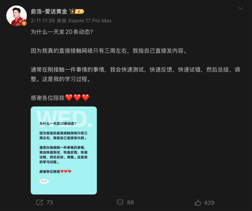 2026年2月11日,俞浩微博上解释了自己为什么一天发20条动态。他直言,“因为我真的直接接触网络只有三周左右,我指自己直接发内容。通常在刚接触一件事情的时候,我会快速测试,快速反馈,快速试错,然后总结、调整。”