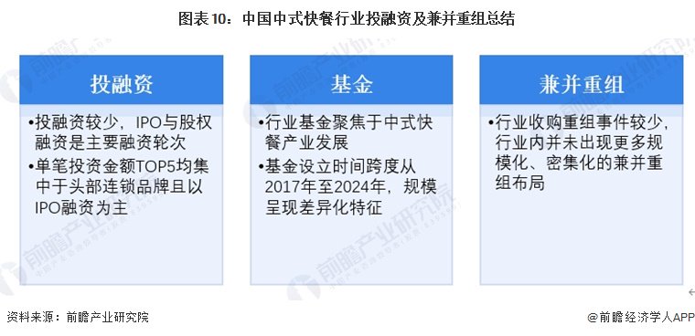 中国中式快餐行业的投融资活动整体较少,IPO与股权融资是主要的融资轮次,单笔投资金额TOP5均集中于头部连锁品牌,且以IPO融资为主;行业内还设立了聚焦中式快餐产业发展的相关基金,设立时间跨度从2017年至2024年,规模呈现差异化特征;相比之下,行业内的收购重组事件较为少见,尚未形成规模化、密集化的兼并重组布局。