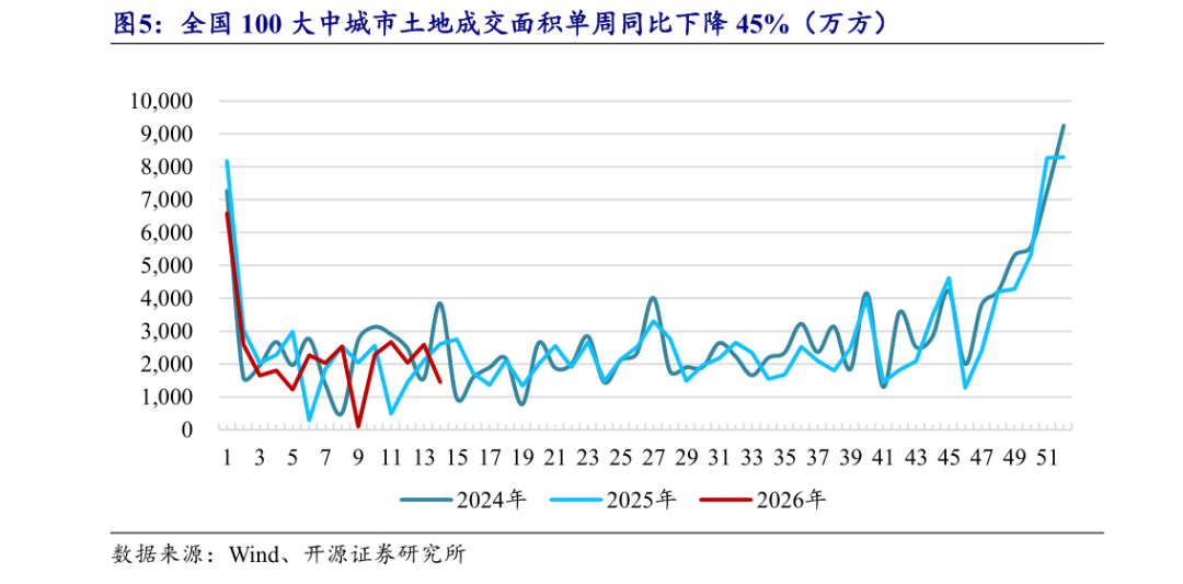 2026年第14周,全国100大中城市成交土地规划建筑面积1446.5万平方米,同比下降45%。2026年前14周,全国100大中城市成交土地规划建筑面积31815.2万平方米,累计同比下降8%。