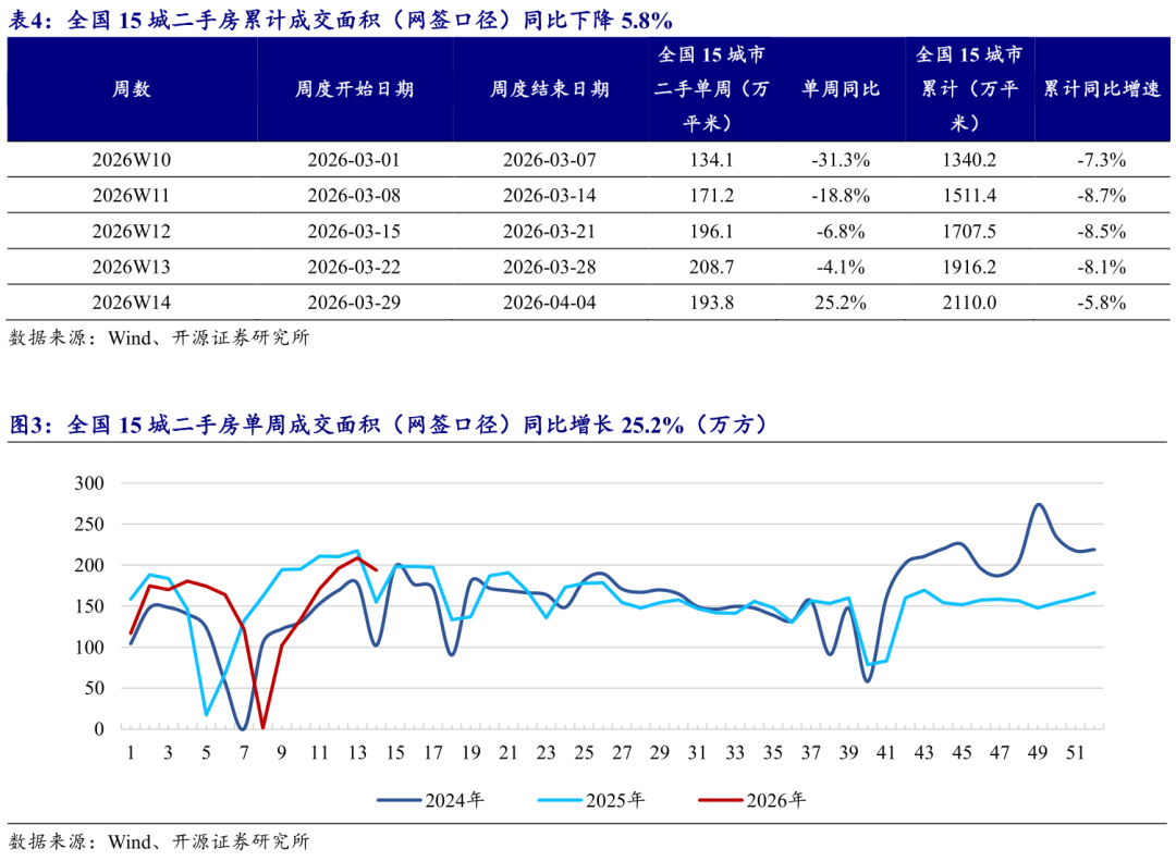 根据房管局数据,2026年第14周,全国15城二手房单周成交面积(网签口径)193.8万平米,单周同比增长25.2%;全国15城二手房累计成交面积(网签口径)2110万平米,累计同比下降5.8%。