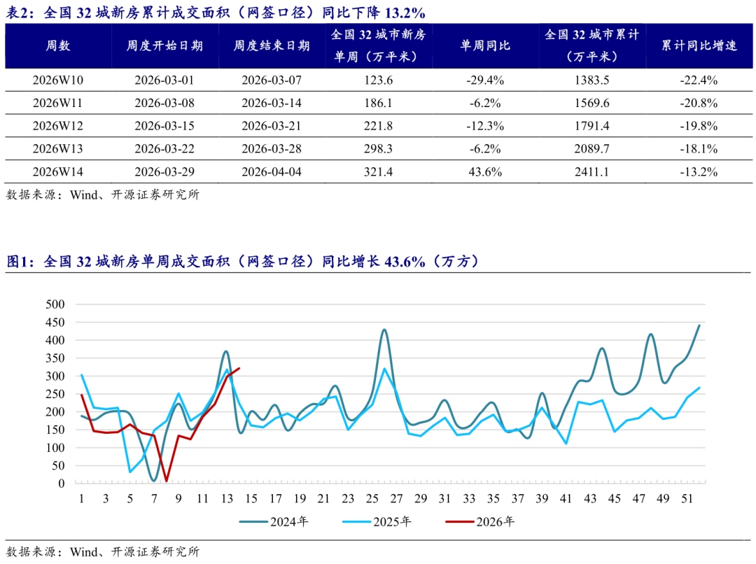 根据房管局数据,2026年第14周,全国32城新房单周成交面积(网签口径)321.4万平米,单周同比增长43.6%;全国32城新房累计成交面积(网签口径)2411.1万平米,累计同比下降13.2%。