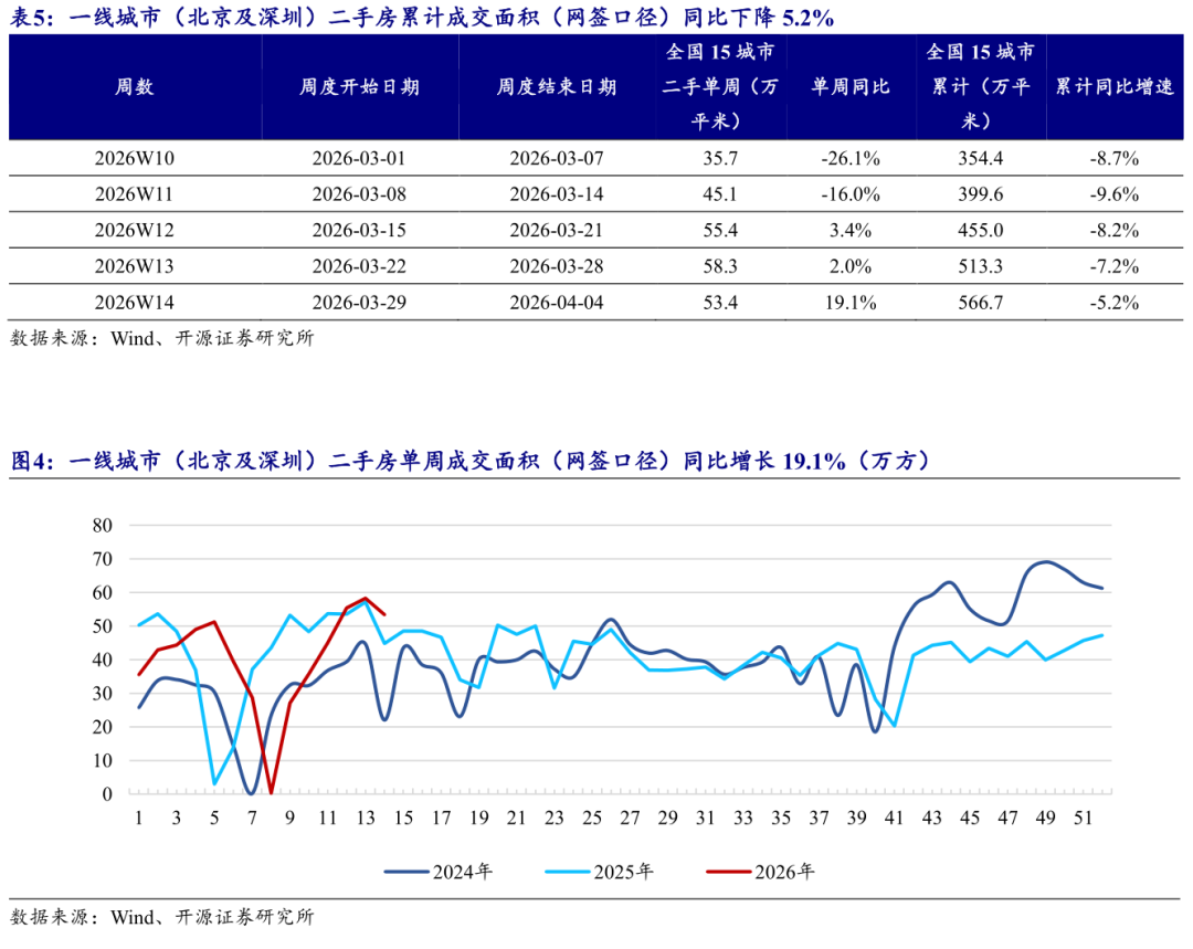 根据房管局数据,2026年第14周,一线城市(北京及深圳)二手房单周成交面积(网签口径)53.4万平米,单周同比增长19.1%;一线城市(北京及深圳)二手房累计成交面积(网签口径)566.7万平米,累计同比下降5.2%。