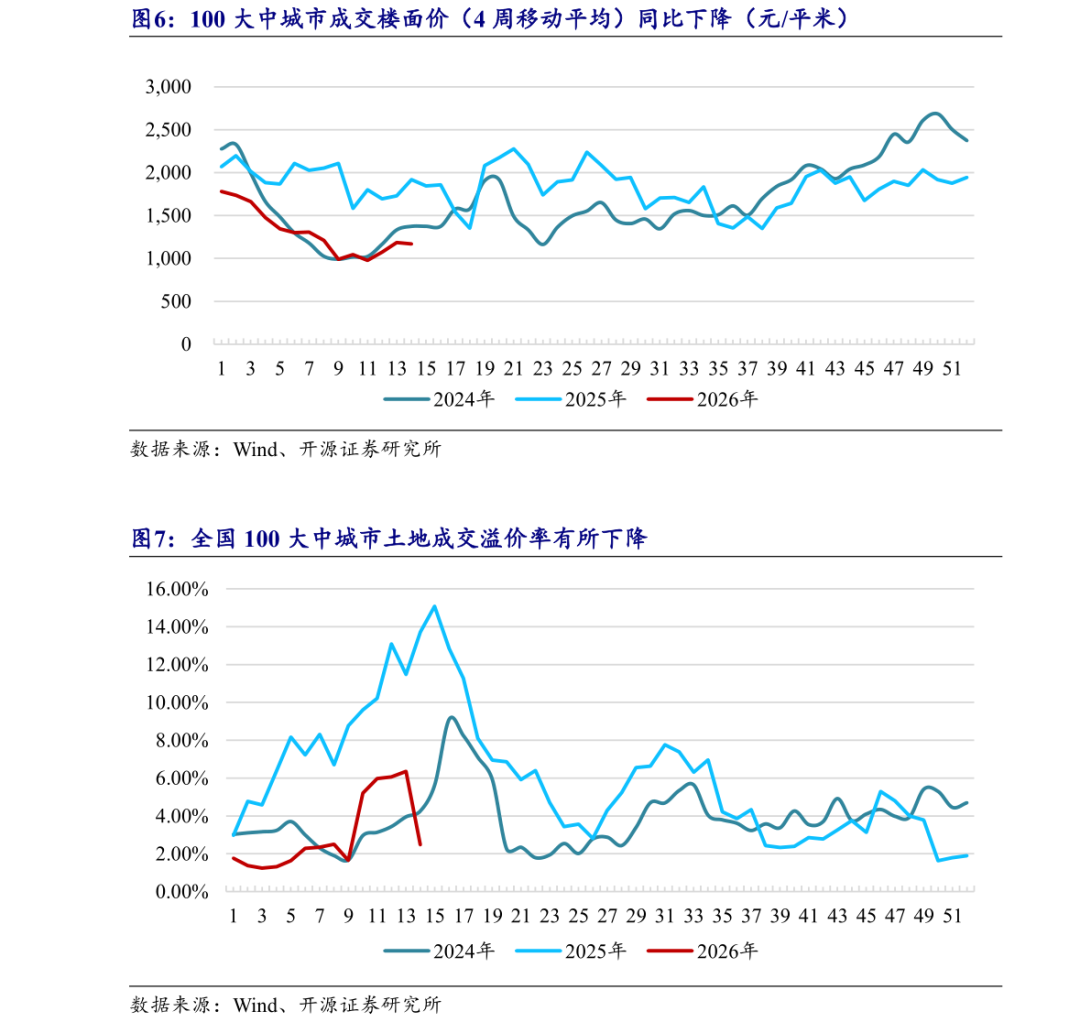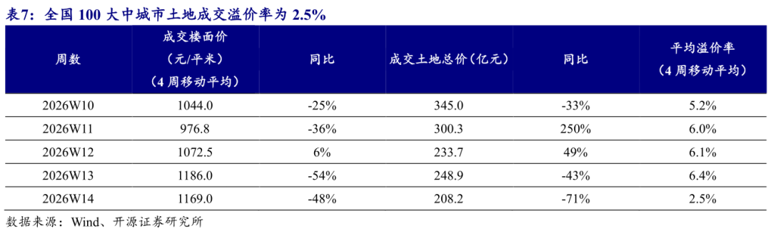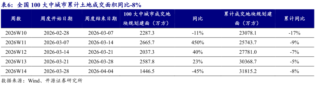 投资端:2026年第14周,全国100大中城市成交土地规划建筑面积1446.5万平方米,同比下降45%。2026年前14周,全国100大中城市成交土地规划建筑面积31815.2万平方米,累计同比下降8%。土地成交楼面价为1169元/平米,同比下降48%;土地成交总价208.2亿元,同比下降71%;平均溢价率(4周移动平均)为2.5%。3月底以来重点城市土地出让减少,成交热度有所下降。