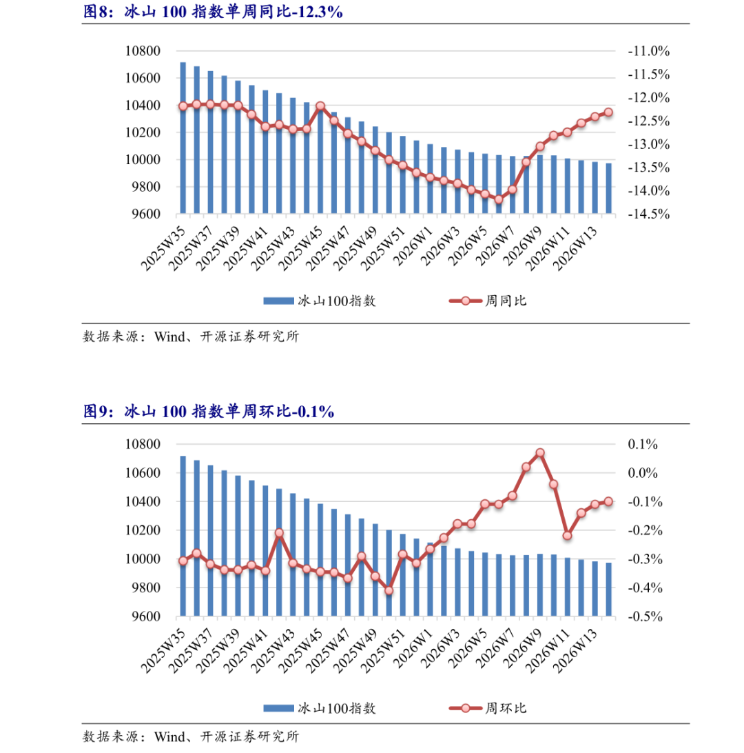 价格端:2026年第14周,冰山100指数为9973,周环比-0.1%,周同比-12.3%;其中北京、上海、深圳、广州周同比分别-14.6%、-10.7%、-9.9%、-12.6%,环比分别-0.1%、+0.2%、-0.1%、+0.1%。