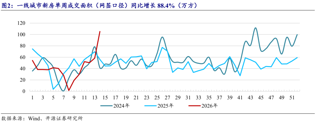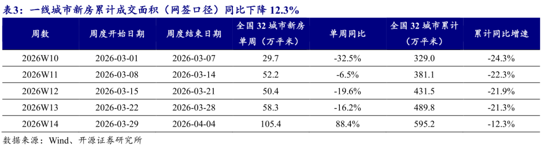 根据房管局数据,2026年第14周,一线城市新房单周成交面积(网签口径)105.4万平米,单周同比增长88.4%;一线城市新房累计成交面积(网签口径)595.2万平米,累计同比下降12.3%。