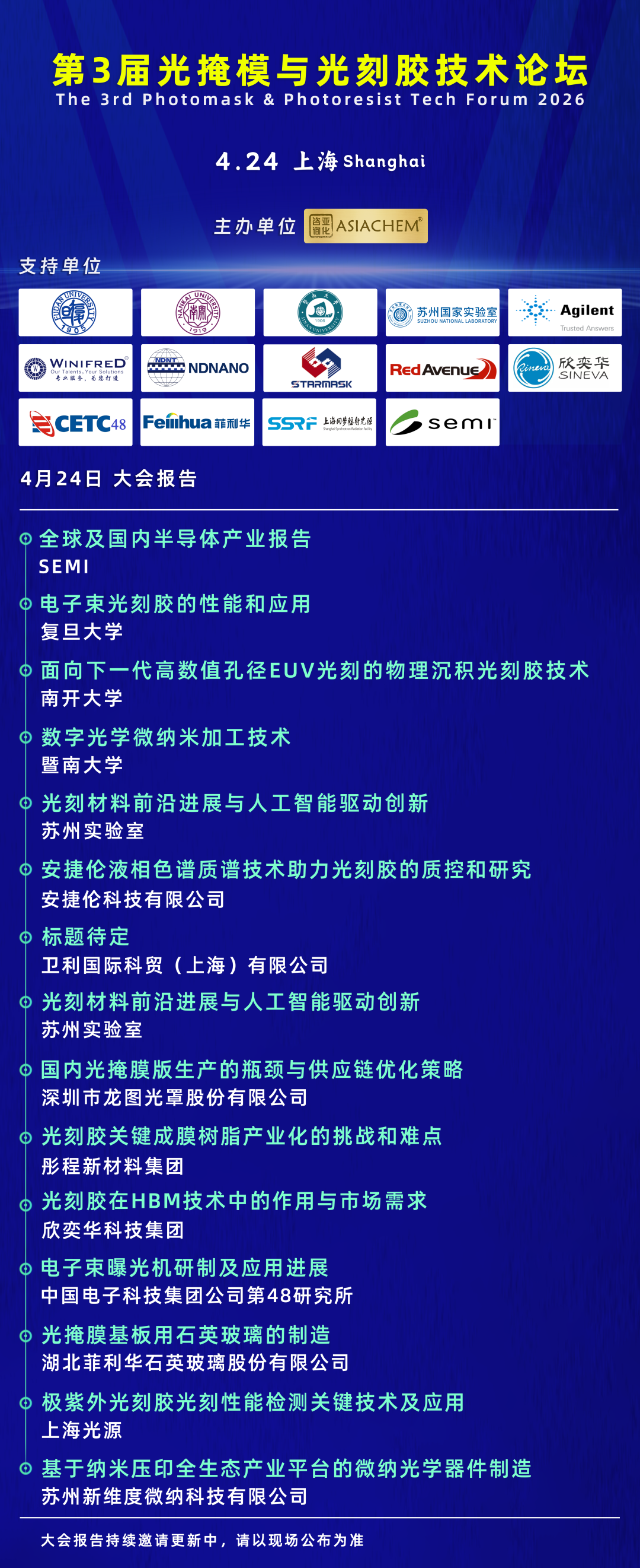 第3届光掩模与光刻胶技术论坛将于2026年4月24日在上海召开。本次论坛由亚化咨询主办。此次会议将汇聚行业的领军企业、机构的专家,探讨下一代光刻技术发展方向,中国光掩模版与光刻胶产业的技术进展与应用,市场机遇与挑战,和产业发展前景。