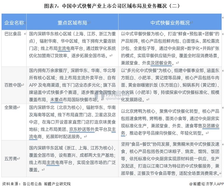 2025年中国中式快餐产业上市企业数量较少,其中,西安饮食、广州酒家、全聚德等A股企业兼具餐饮服务与食品加工销售业务,全聚德依托老字号品牌形成多品牌矩阵;巴比食品、五芳斋则深耕食品研发生产赛道,分别聚焦中式面点与糯米食品领域。具体情况如下所示: