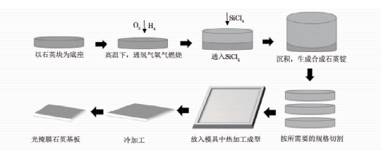 作为光掩模基板用石英玻璃的核心环节,石英锭的制备工艺主要分为熔炼石英玻璃与合成石英玻璃两类:熔炼石英玻璃以电熔工艺和气炼工艺为主;合成石英玻璃则包括化学气相沉积(CVD)、等离子化学气相沉积(PCVD)、间接合成法等。其中,以合成石英制成光掩模石英玻璃基板的工艺尤为复杂,以应用广泛的化学气相沉积法(CVD)为例,需以SiCl4为原料,在氢氧焰中高温水解生成SiO2微粒,经沉积熔化形成高纯石英锭,再通过切割、热加工(成型为石英板)、冷加工(切割、开方、倒角、磨抛等),最终制成光掩模石英玻璃基板。