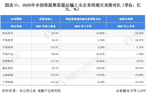 中国铁路集装箱运输行业上市公司中,中国外运2025年前三季度营收为750.38亿元,2025年1-6月毛利率为7.50%;大秦铁路2025年前三季度营收为570.58亿元,2025年1-6月毛利率为13.99%;中国铁物2025年前三季度营收为255.97亿元,2025年1-6月毛利率为8.51%。整体来看,中国铁路集装箱运输行业领先的上市公司毛利率普遍较低。
