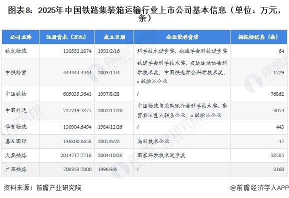 从铁路集装箱运输行业的上市企业布局和已有公开信息分析,注册资本最大的公司是大秦铁路,达201.47亿元;招投标信息最多的公司是中国铁物,成立时间最早的是华贸物流。