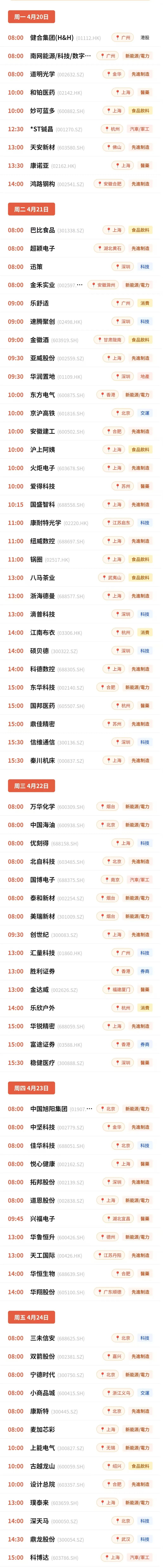 北京地区以综合型大公司为主:京沪高铁(交通运输,4/21)、中国海油(能源巨头,4/22)、三未信安(密码安全,4/24)、宁德时代(电池龙头,4/24)、深天马(车载显示,4/24)。北京场次虽数量不突出,但单场重量级极高,多为公司一把手或IR总监出席。