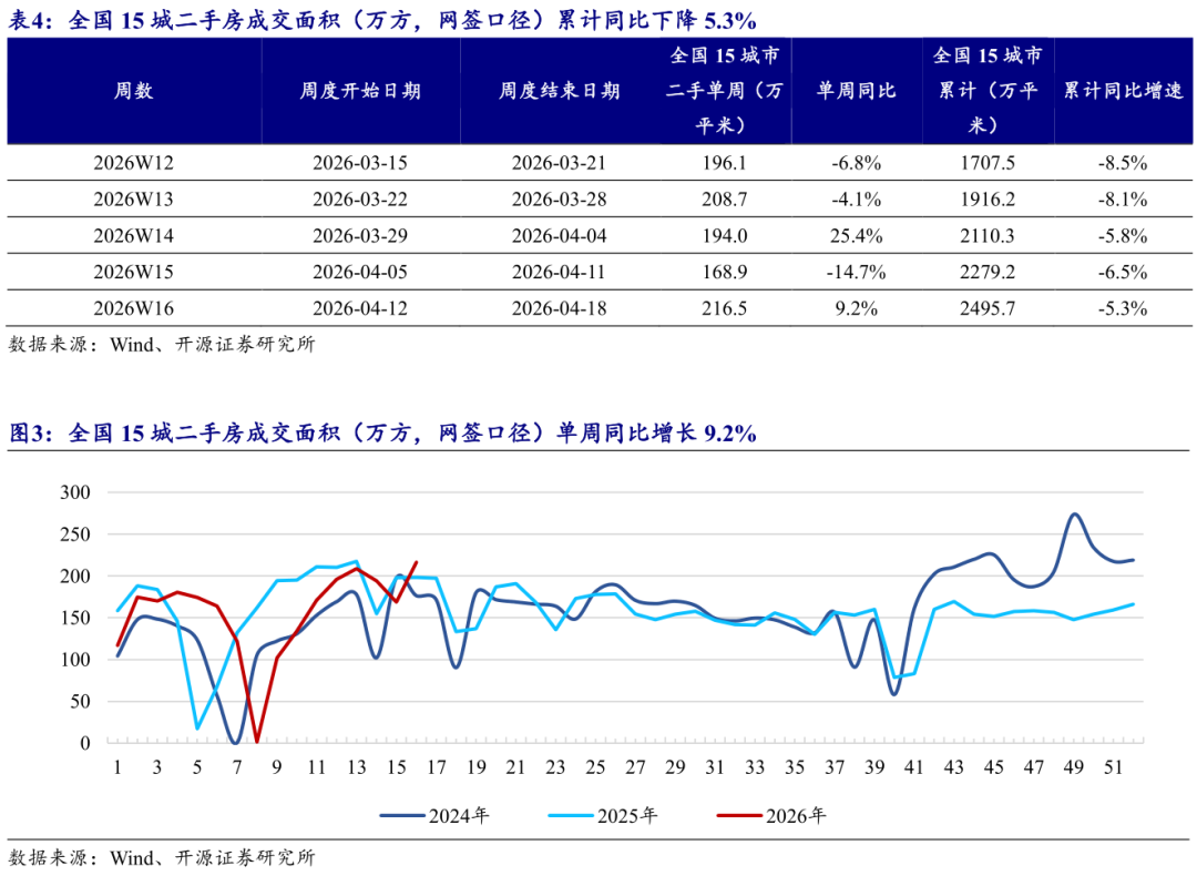 根据房管局数据,2026年第16周,全国15城二手房单周成交面积(网签口径)216.5万平米,单周同比增长9.2%;全国15城二手房累计成交面积(网签口径)2495.7万平米,累计同比下降5.3%。