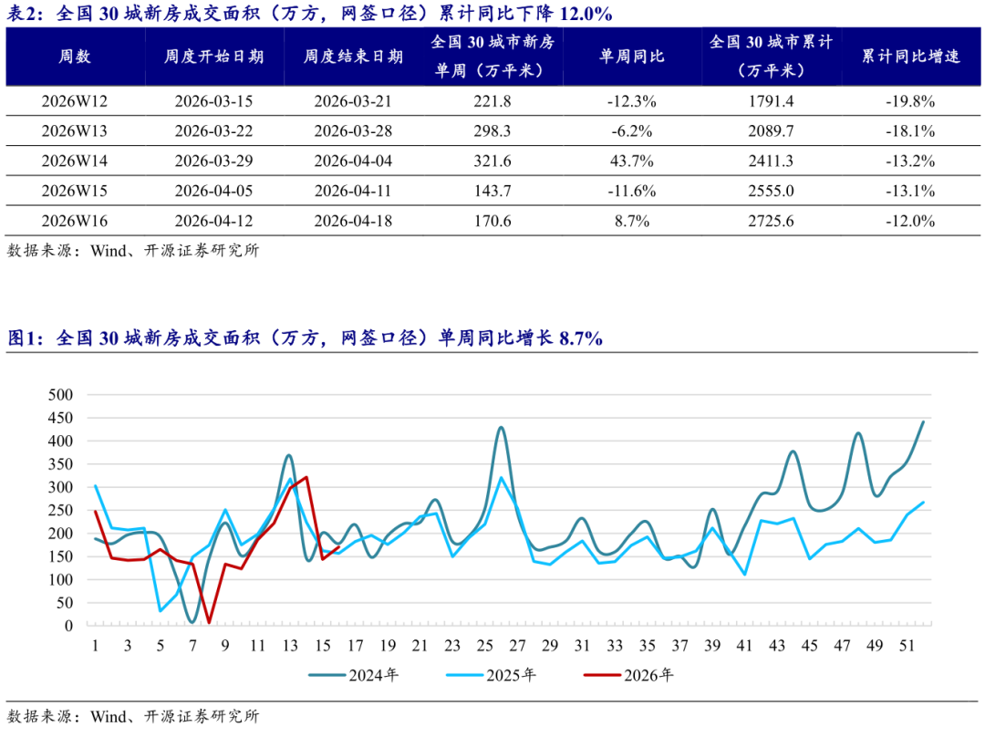 根据房管局数据,2026年第16周,全国30城新房单周成交面积(网签口径)170.6万平米,单周同比增长8.7%;全国30城新房累计成交面积(网签口径)2725.6万平米,累计同比下降12.0%。