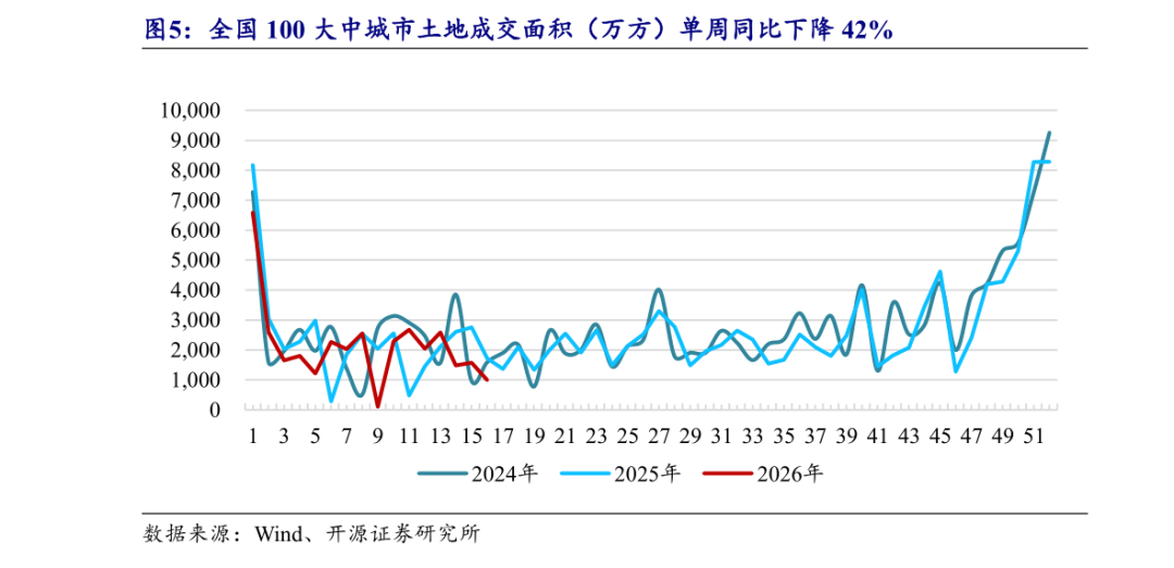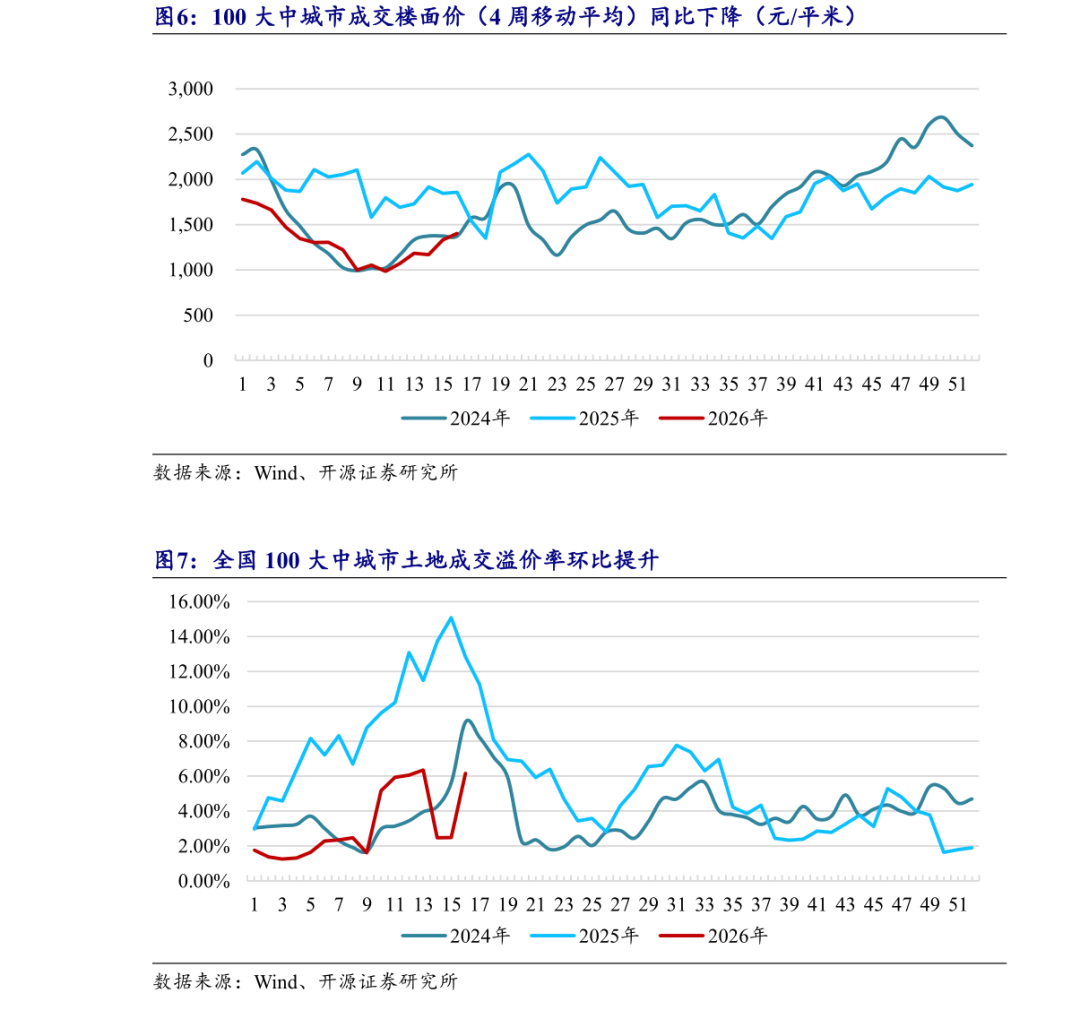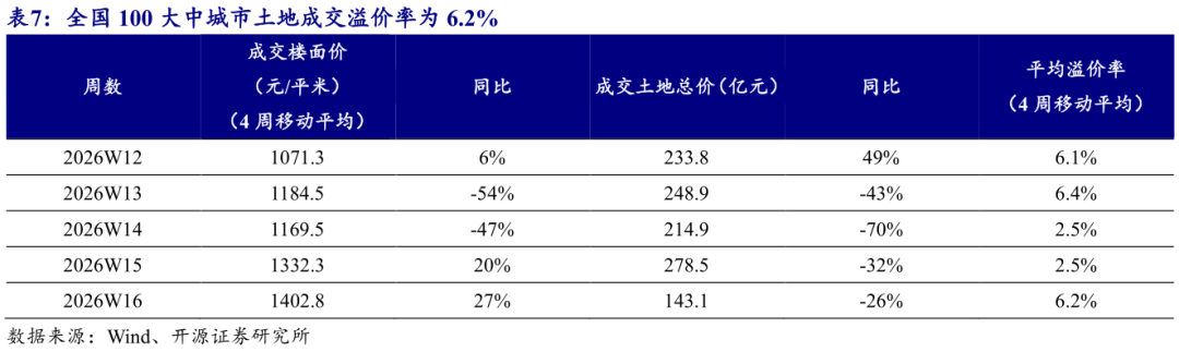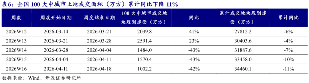 投资端:2026年第16周,全国100大中城市成交土地规划建筑面积1002.2万平方米,同比下降42%。2026年前16周,全国100大中城市成交土地规划建筑面积34460.1万平方米,累计同比下降11%。土地成交楼面价为1403元/平米,同比增长27%;土地成交总价143.1亿元,同比下降26%;平均溢价率(4周移动平均)为6.2%。3月底以来重点城市土地出让减少,成交热度仍处低位。