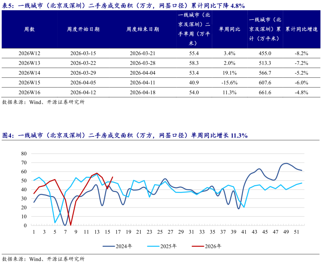 根据房管局数据,2026年第16周,一线城市(北京及深圳)二手房单周成交面积(网签口径)54.0万平米,单周同比增长11.3%;一线城市(北京及深圳)二手房累计成交面积(网签口径)661.6万平米,累计同比下降4.8%。