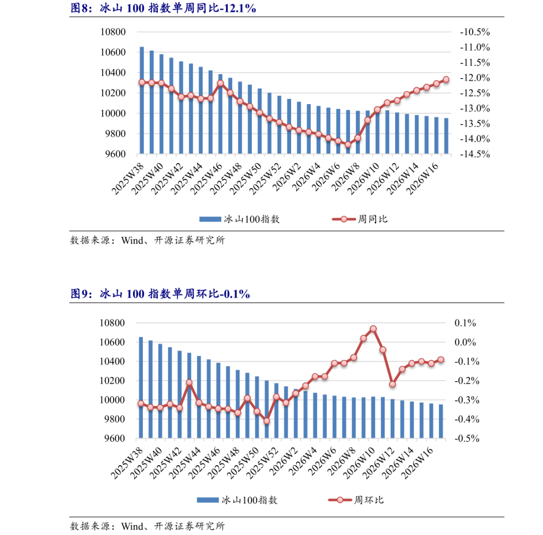 价格端:2026年第16周,冰山100指数为9953,周环比-0.1%,周同比-12.1%。