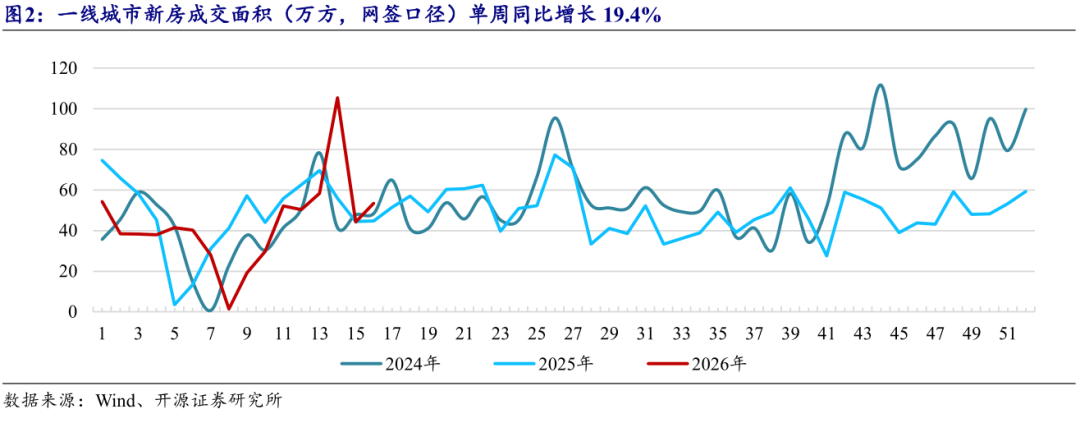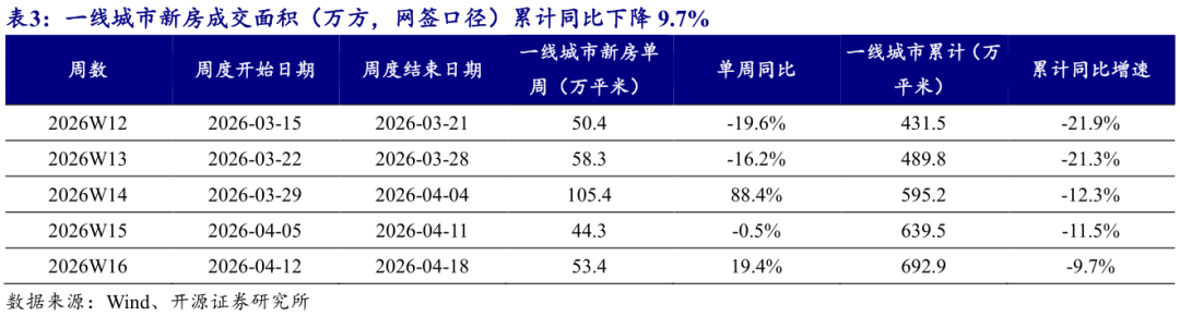 根据房管局数据,2026年第16周,一线城市新房单周成交面积(网签口径)53.4万平米,单周同比增长19.4%;一线城市新房累计成交面积(网签口径)692.9万平米,累计同比下降9.7%。