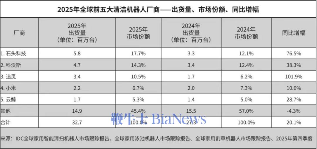 2025年,全球扫地机器人市场前五名被中国品牌包揽,石头科技以580万台、17.7%的份额位居第一,科沃斯和追觅分别以470万台、340万台位列二、三名。美国的iRobot在2025年底正式申请破产保护,扫地机器人的“中国军团”完成了对全球市场主导权的全面接管。