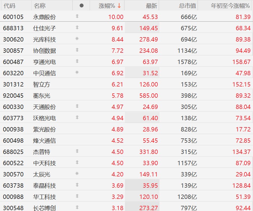 格隆汇4月22日|A股CPO概念股集体上涨,其中,永鼎股份10CM涨停,仕佳光子涨超9%,光库科技涨超8%,协创数据涨超7%,亨通光电、中贝通信、智立方涨超6%,衡东光涨超5%,天通股份、沃格光电、紫光股份、烽火通信、杰普特、中天科技、太辰光涨超4%。