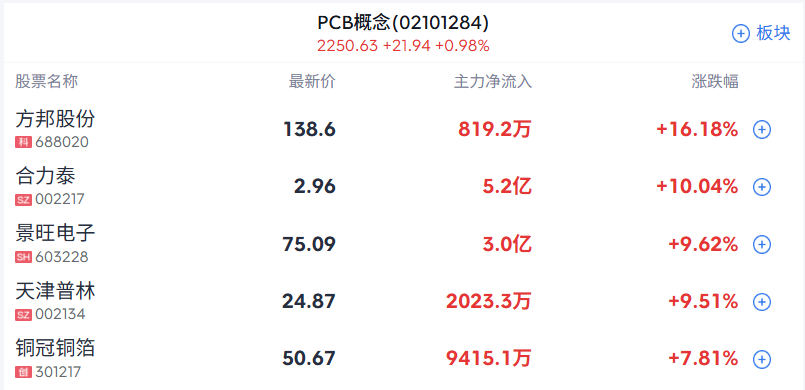 PCB概念反复活跃,CCL方向领涨,方邦股份逼近涨停,有研粉材涨超10%,逸豪新材、景旺电子、国际复材、德福科技跟涨。