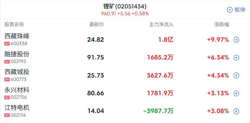 锂矿概念反复活跃,西藏珠峰触及涨停,融捷股份、盐湖股份、盛新锂能、天齐锂业跟涨。