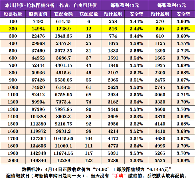 一手党:4月16日当天收盘后持有200股“本川智能”的股票,可以获配12张可转债。