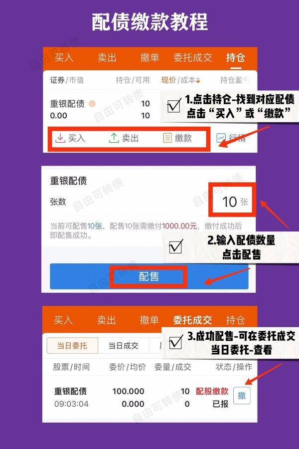 配债缴款:持有股票要“配债”的老板,需要在新债申购日/配债缴款日当天(4月17日),去到资金持仓里面找到对应的配债(某某配债|6位数配债代码),然后手动点击“买入”或“缴款”还有“卖出”都可完成缴款。如果没有“手动点击缴款”的话,交易时间段一过直接当弃购!卖出正股的可用资金,可以直接用于配债缴款。
