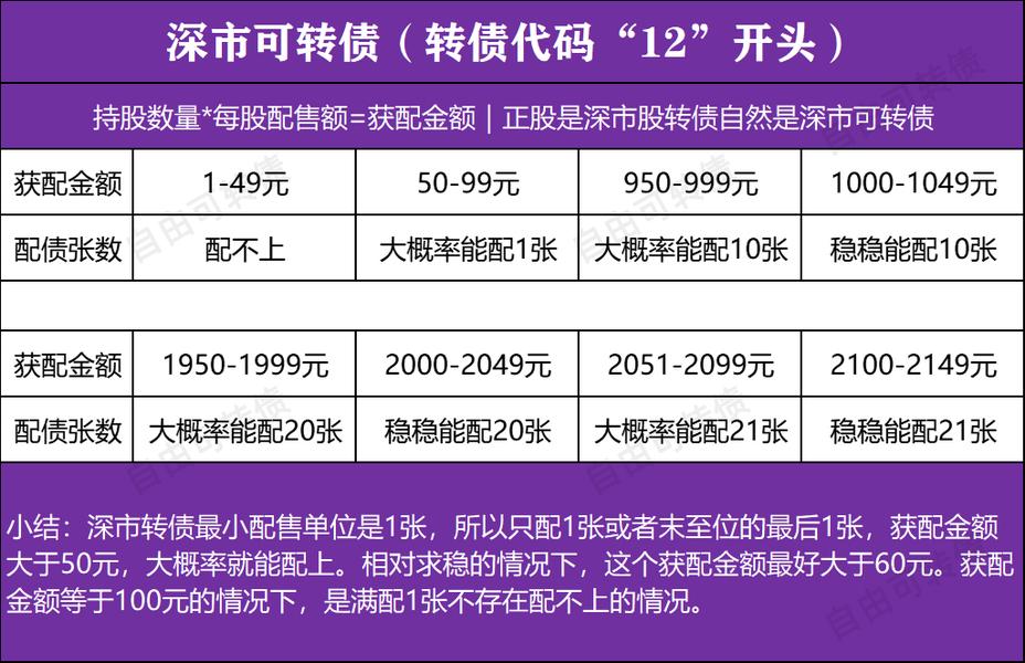深市可转债:获配金额每满100元就能获配1张转债。只配1张转债和末置位的最后1张转债,获配金额大于50元大概率就能配上。例如获配金额950元,大概率能配上10张转债,其中9张是稳稳的能配上,末置位的最后1张有概率配不上。想要稳稳的获配10张转债,获配金额最好大于等于1000元。