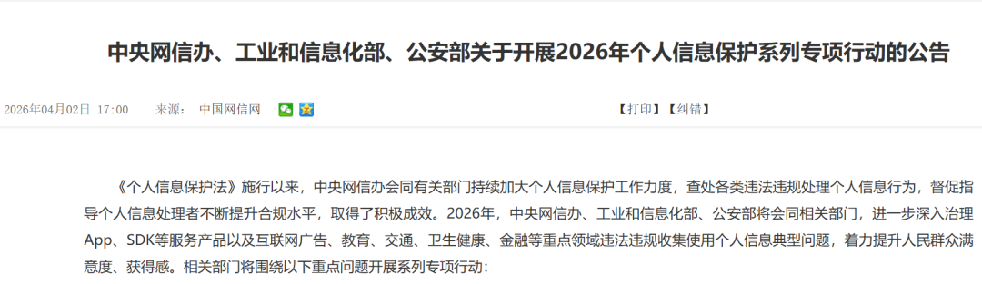 自《个人信息保护法》施行以来,多部门持续查处个人信息违法违规行为,保护工作成效显著。2026年4月,多部门联合启动本次专项行动,聚焦App、SDK及教育、交通、卫生健康、金融等重点领域,靶向治理典型问题,对情节严重、拒不整改的主体从严处置,确保行动落地见效。
