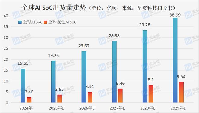端侧AI的崛起正在重塑全球半导体产业的价值链。过去几年,人工智能的算力需求主要集中在云端数据中心,英伟达、AMD等企业凭借GPU芯片攫取了产业大部分利润。然而,随着大模型技术迭代和轻量化模型突破,AI推理能力开始向终端设备下沉——智能手机、可穿戴设备、智能摄像头、机器人、智能汽车等场景对本地化、低延迟、隐私保护的AI处理能力需求激增。这一转变催生了端侧AI芯片的爆发式增长。根据弗若斯特沙利文的预测,全球视觉AI SoC出货量将从2024年的2.46亿颗增长至2029年的9.54亿颗,复合年增长率超过30%;更广泛的AI SoC全球出货量预计将从2024年的15.65亿颗扩张至2029年的38.99亿颗。