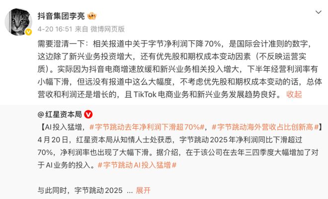 抖音集团副总裁李亮很快回应:净利润下滑是国际会计准则的数字,包含优先股和期权成本变动,不反映运营实质。剔除这些会计因素后,字节总体营收和利润仍然是增长的。