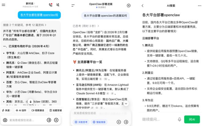 另一个更早出现且更通用的Agent来自开源社区。2025年11月发布的AI智能体框架OpenClaw(被国内用户亲切地称为“小龙虾”),到2026年3月GitHub星标数突破28万,成为GitHub历史上获星最多的软件项目。它让AI从“只说不做”变成了“能动手”——一句话指令,AI就能操控电脑、整理文件、运营社媒。火山引擎、阿里云、腾讯云、百度智能云全部在抢着接入部署。