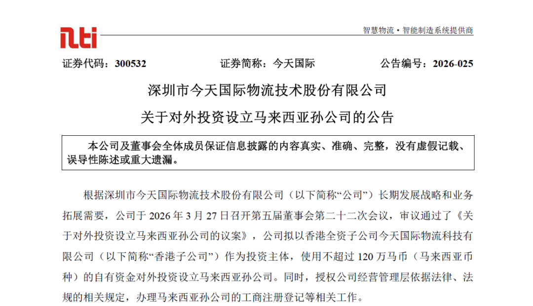 今天国际股票代码:300532.SZ马来西亚公司:New Trend International Logistics (Malaysia)投资规模:≤120 万马币设立状态:推进中核心业务:智能物流系统集成