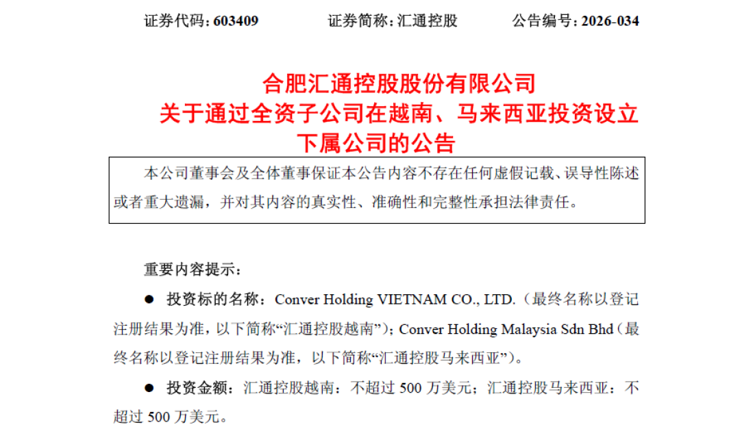 公司拟通过全资香港子公司 Conver Holding Hongkong Co., Limited,在马来西亚投资设立全资子公司:Conver Holding Malaysia Sdn Bhd(最终以当地注册为准)