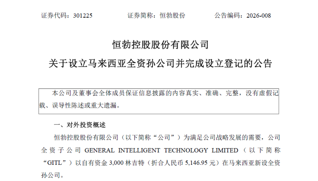 三、恒勃股份:马来西亚公司已完成注册落地