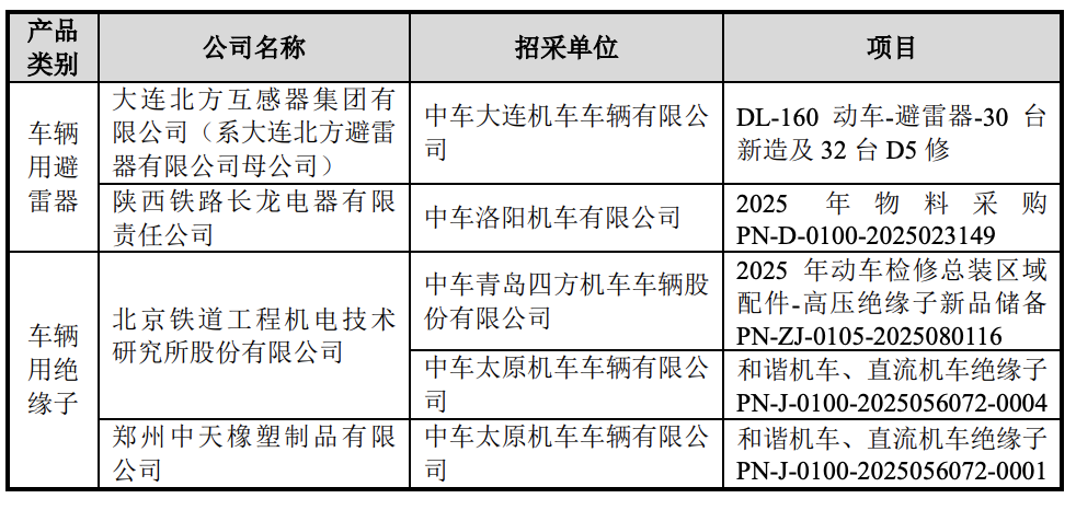 另一方面2025年,大连北方、陕西长龙在中国中车及子公司的车辆用避雷器领域获得项目,北京铁道研究所、郑州中天在车辆用绝缘子项目中标。