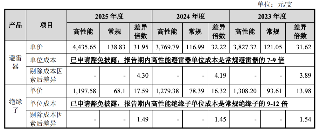 对此,公司解释称,由于高性能产品的尺寸重量通常更大、用料成本更高,生产过程更为复杂且控制精度要求更高、性能指标更为严格,因此,其材料、人工、制费等更高,报告期内,高性能避雷器平均成本是常规避雷器的7-9倍,高性能绝缘子平均成本是常规绝缘子的9-12倍。