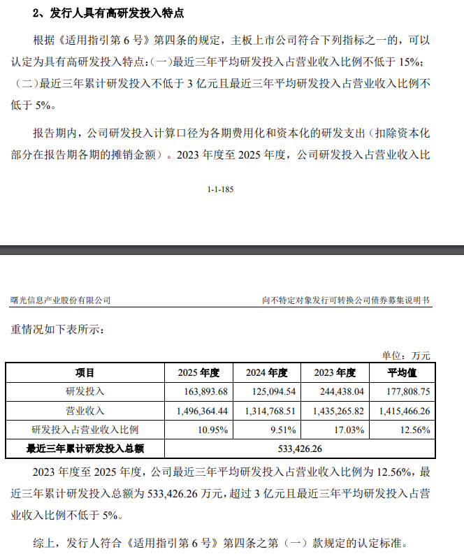 根据中科曙光可转债募集说明书,公司具有“轻资产、高研发投入”特征,此次再融资适用“轻资产、高研发投入”标准。