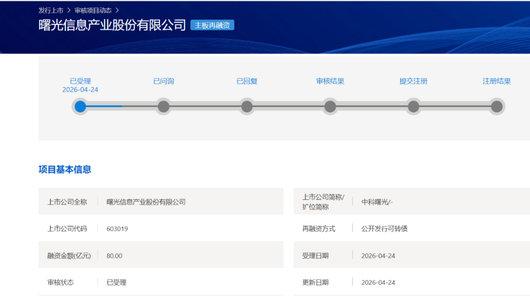 4月24日,上交所官网信息显示,中科曙光向不特定对象发行可转债项目获受理。这是沪市首单主板“轻资产、高研发投入”再融资项目。